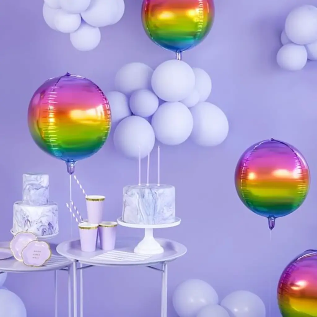 Mit runden Mylar-Ballons in den Farben desRegenbogens können Sie für die Geburtstage Ihrer Kinder eine zauberhafte und bezaubernde Atmosphäre schaffen. Spielen Sie mit Nuancen und stellen Sie sich eine magische Welt vor, in der sich Regenbogenluftballons mit weißen, luftigen Luftballons über einem Tisch vermischen, der mit Kuchen mit nuancierter Glasur und süßen Details bedeckt ist.