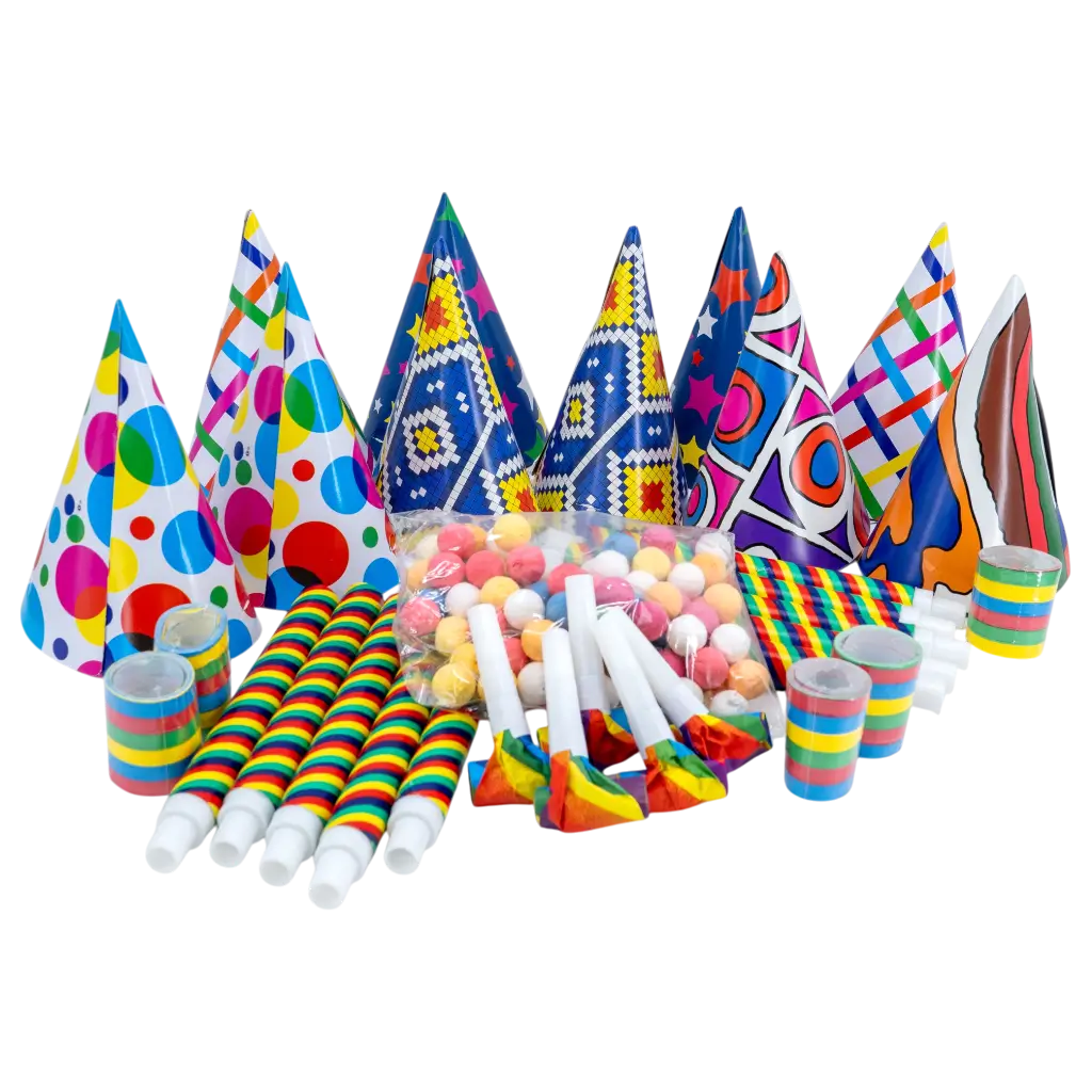 Unser Cotillons Kit für 10 Personen besteht aus verschiedenen Accessoires (Blasrohre, Hüte, Luftschlangen usw.) und enthält alles, was Sie für ein stimmungsvolles Fest benötigen. Lassen Sie Ihrer Fantasie freien Lauf und entwerfen Sie tausend kreative Möglichkeiten, dieses Set zu verwenden. Feiern Sie, amüsieren Sie sich und erleben Sie einzigartige Glücksmomente!