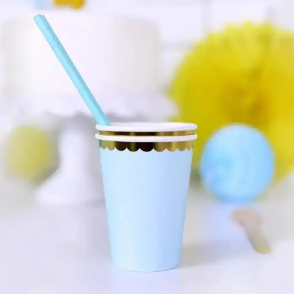 Satz von 6 Papierbechern, hellblau mit goldenen Metallrändern, nur für kalte Getränke. Fassungsvermögen: 22cl