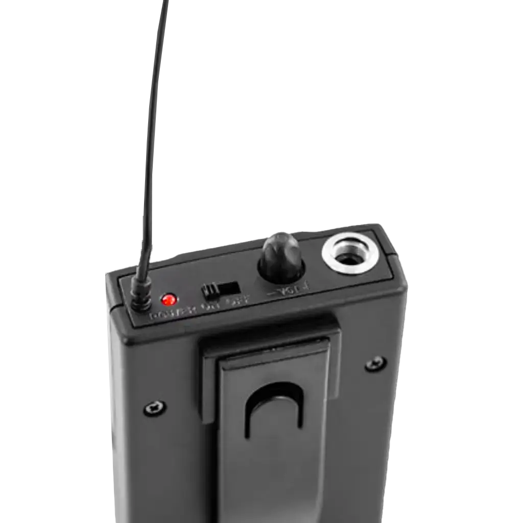 - Mikrofoneingang 3,5 mm Klinke am Taschensender + Kopfbügelmikrofon.